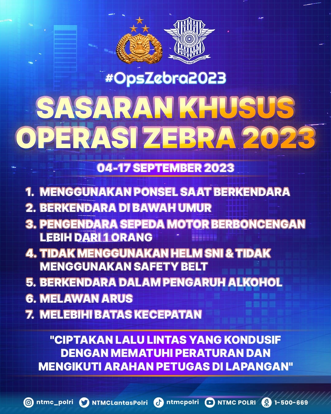 Operasi Zebra 2023 bertujuan untuk menciptakan lalu lintas yang kondusif dengan mematuhi peraturan dan mengikuti arahan petugas di lapangan.